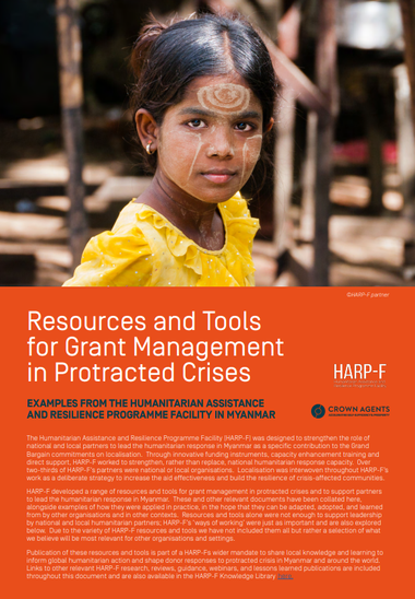 HARP-F developed a range of resources and tools for grant management in protracted crises and to support partners to lead the humanitarian response in Myanmar. These and other relevant documents have been collated here, alongside examples of how they were applied in practice, in the hope that they can be adapted, adopted, and learned from by other organisations and in other contexts.