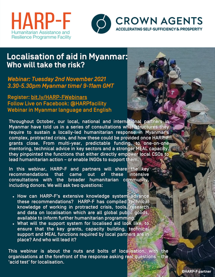 This is the fourth webinar in a series on ‘Rethinking humanitarian aid in protracted crises’ hosted by the Humanitarian Assistance and Resilience Programme Facility (HARP-F). The series invites local and national actors to share their expertise in delivering humanitarian programmes in Myanmar’s complex crisis, and encourages discussions on aid modalities and lessons learned in other protracted crisis contexts.