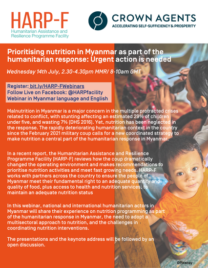 Emily Mates, Technical Director of the Emergency Nutrition Network (ENN) gave an address on key nutrition concepts and the implications of malnutrition on human capital in this HARP-F webinar held on 14th July, 2021. Speakers from Kachin Light (WPN), the Myanmar Health Assistant Association, Save the Children and Action contre la Faim shared how they adapted their nutrition programming in Myanmar in the COVID-19 and post-coup context, and made recommendations to put nutrition at the top of the humanitarian response. A Global Nutrition Cluster speaker called nutrition partners to act for better data, more external support, and increased emergency response preparedness.